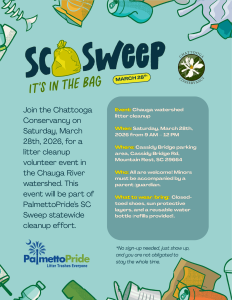 Join the Chattooga Conservancy on Saturday, March 28th, 2026, for a litter cleanup volunteer event in the Chauga River watershed. This event will be part of PalmettoPride’s SC Sweep statewide cleanup effort. We will meet at Cassidy Bridge parking area to sign in and distribute cleanup tools/ protective equipment. Chattooga Conservancy staff will lead volunteers in small groups, removing litter from the parking area and upstream/downstream along the Chauga River. This is a great opportunity to participate in public lands stewardship and contribute to cleaner shared spaces in the Chattooga’s sister watershed – the Chauga!