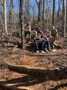 Walhalla Scout Troop 45 collaborated with the Chattooga Conservancy to restore a section of trail at the southern end of Stekoa Creek Park. Scouts and scout leaders helped shape several new trail steps from rot-resistant locust wood previously felled at the park. The Scouts hewed and processed the locust wood steps themselves using traditional hand tools such as foot and bowl adzes and brace-and-bit hand drills. Troop 45 then installed the new steps and helped root out invasive species along the trail.